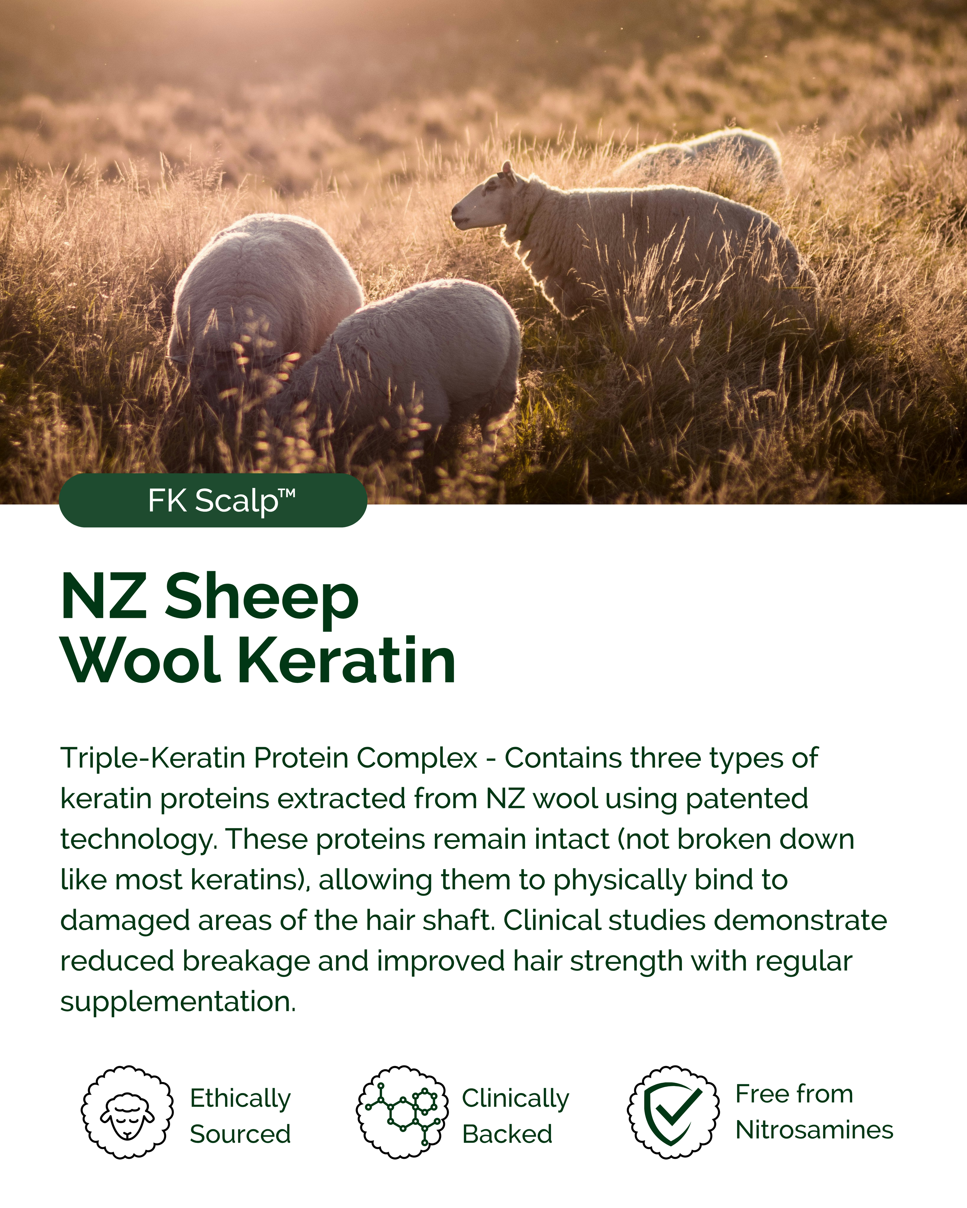 Our Functional Keratin™ is 91% bio-identical to human keratin (most come from chicken feathers - yes, really). It's ethically sourced from NZ sheep wool, nitrosamine-free, and the proteins remain intact so your body actually recognises and uses them. That's why it works.