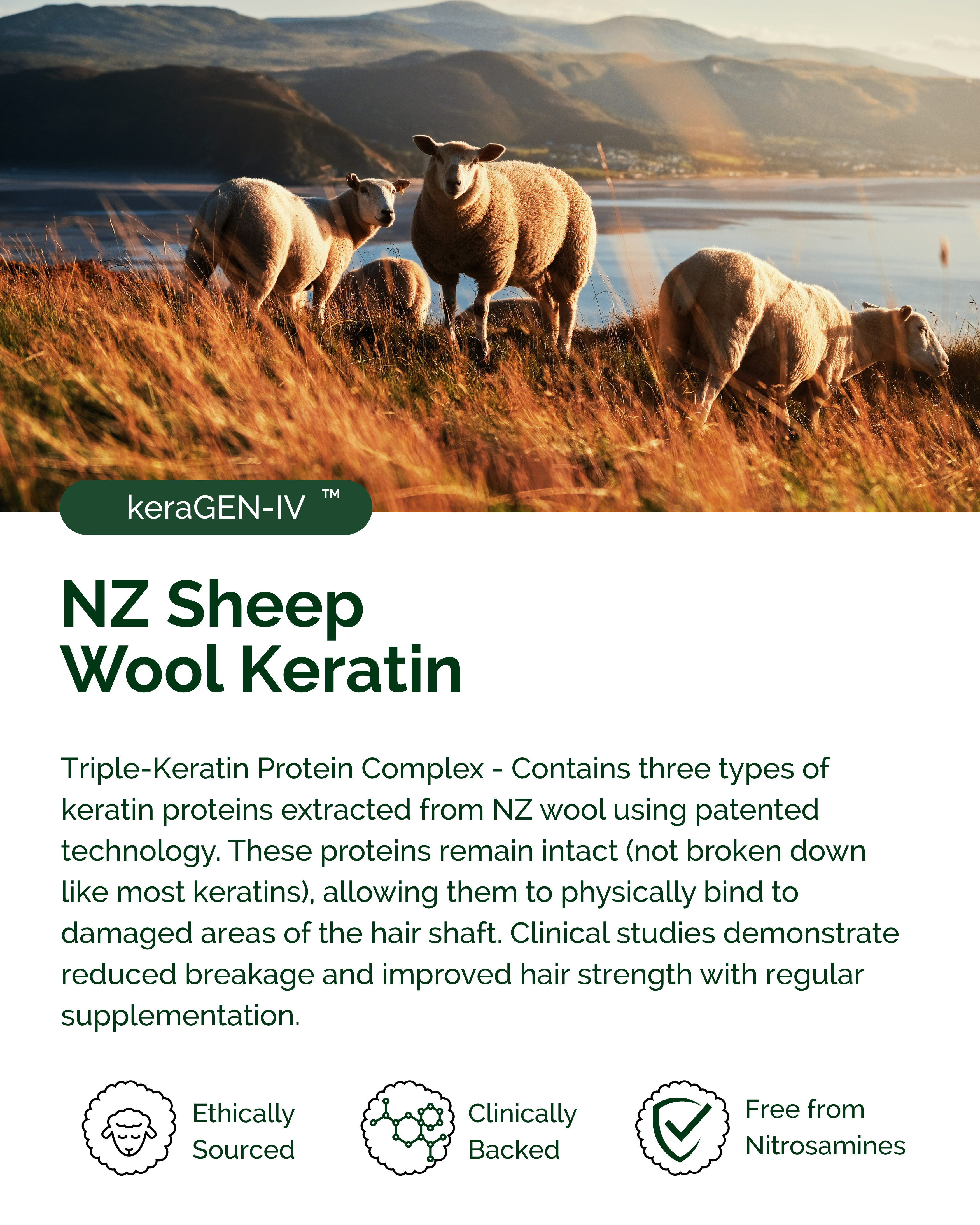 Our Functional Keratin™ is 91% bio-identical to human keratin (most come from chicken feathers - yes, really). It's ethically sourced from NZ sheep wool, nitrosamine-free, and the proteins remain intact so your body actually recognises and uses them. That's why it works.